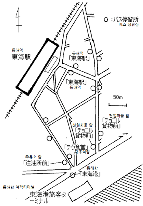 主なものは21−1番、31−1番、91番バスです。21−1番については「東海港」バス停で、31−1番と91番については「チョニル貨物前」バス停で下車すると港はすぐそばです。1000w(座席バスは1400w)(画像50,51,52)